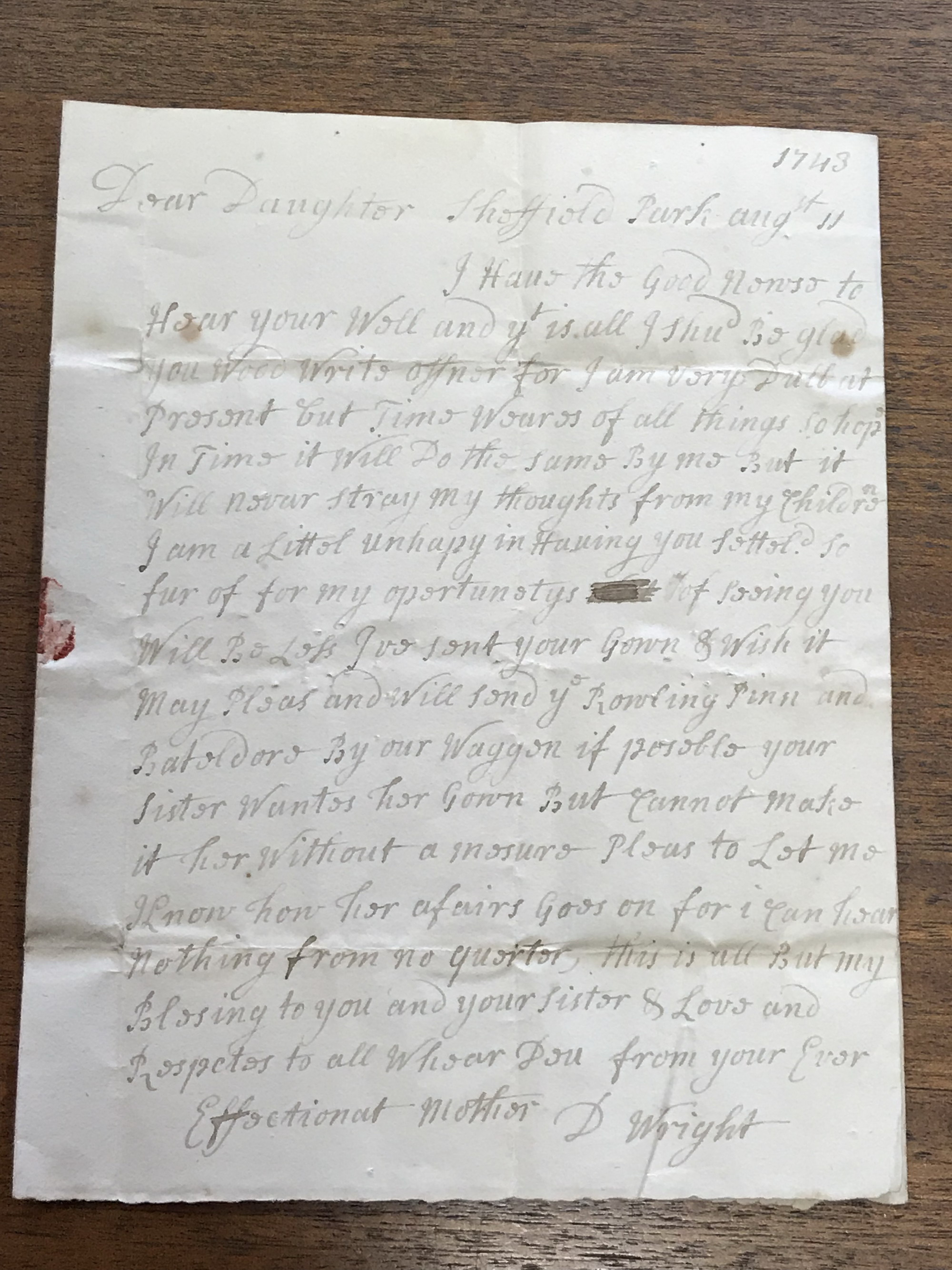 02 - Letter from Dorothy Wright to Catherine Elliott - 11 August 1743 - Transcription and Commentary