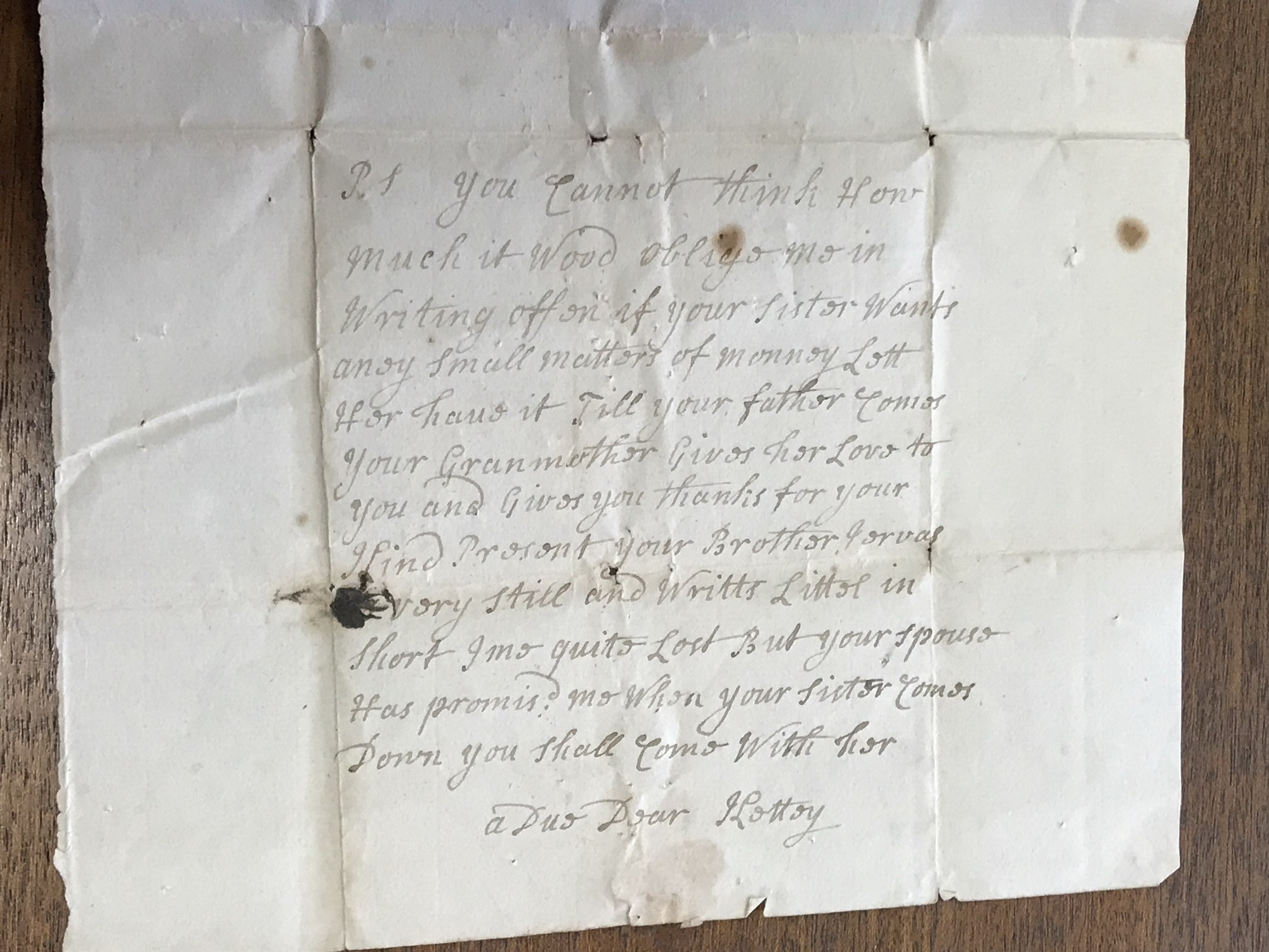 Dorothy was obviously missing her adult children and feeling neglected by them. Her daughter Rebecca[iv], it seems, was away from home – the letter suggests that she was visiting her sister in Stony Stratford. In Dorothy’s opinion, neither sister wrote home frequently enough.